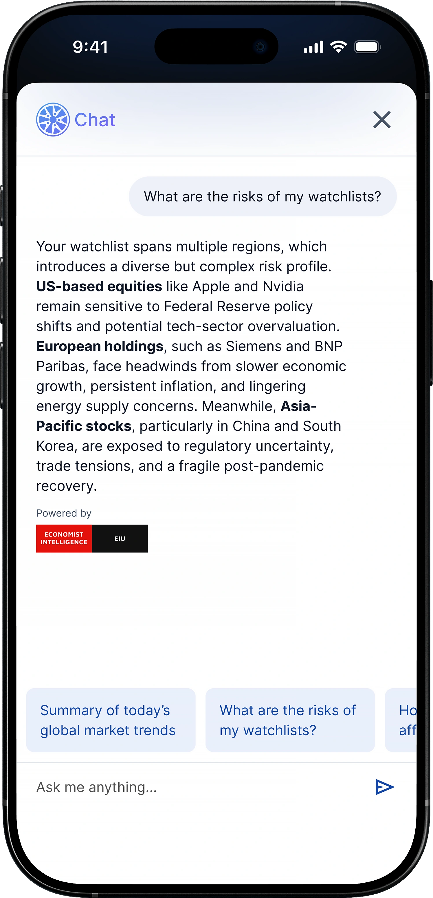Instant answers and analysis on your watchlist or portfolio, delivered in your workflow.