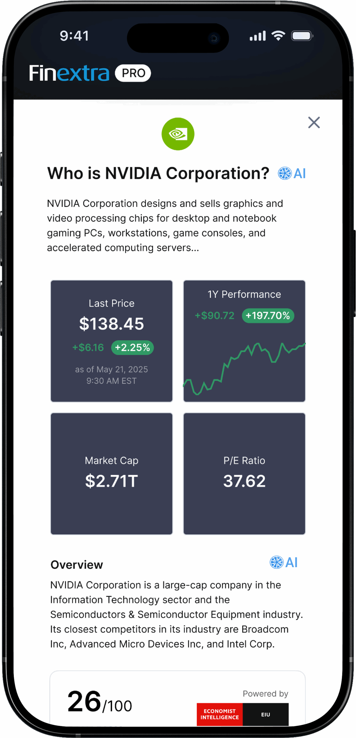 Everything you need to know about a company or fund in a single narrative. Real-time analyst ratings and more.